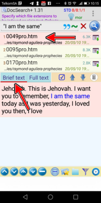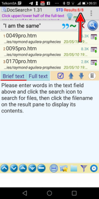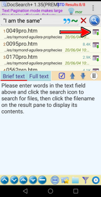 DocSearch is a very powerful app, like no other similar app I could find on on the Google App Store, and highly recommended for searching Raymond Aguilera's prophecies on Android devices. In my opinion, even the Microsoft search does not even have the the same powerfull functionality of as DocSearch. In the past I used an app called AndroSearch, but it's search functionality was very poor. DocSearch+ is free, but with limitations and adverts, but really worth the money to get the full power of this app. I am posting this, because I downloaded this program about a year ago, and it did not work, so I tried it again about two weeks ago, and still did not work for me. But when you read the comments, user feedback was very positive. So I sought to find why it does not work for me, and finally I discovered why, and thus the need to make this posting, to help others benefit from an excellent text search application. You can download DocSearch+ from Google App Store on your Android phone using the following link. https://play.google.com/store/apps/details?id=com.docsearch.pro